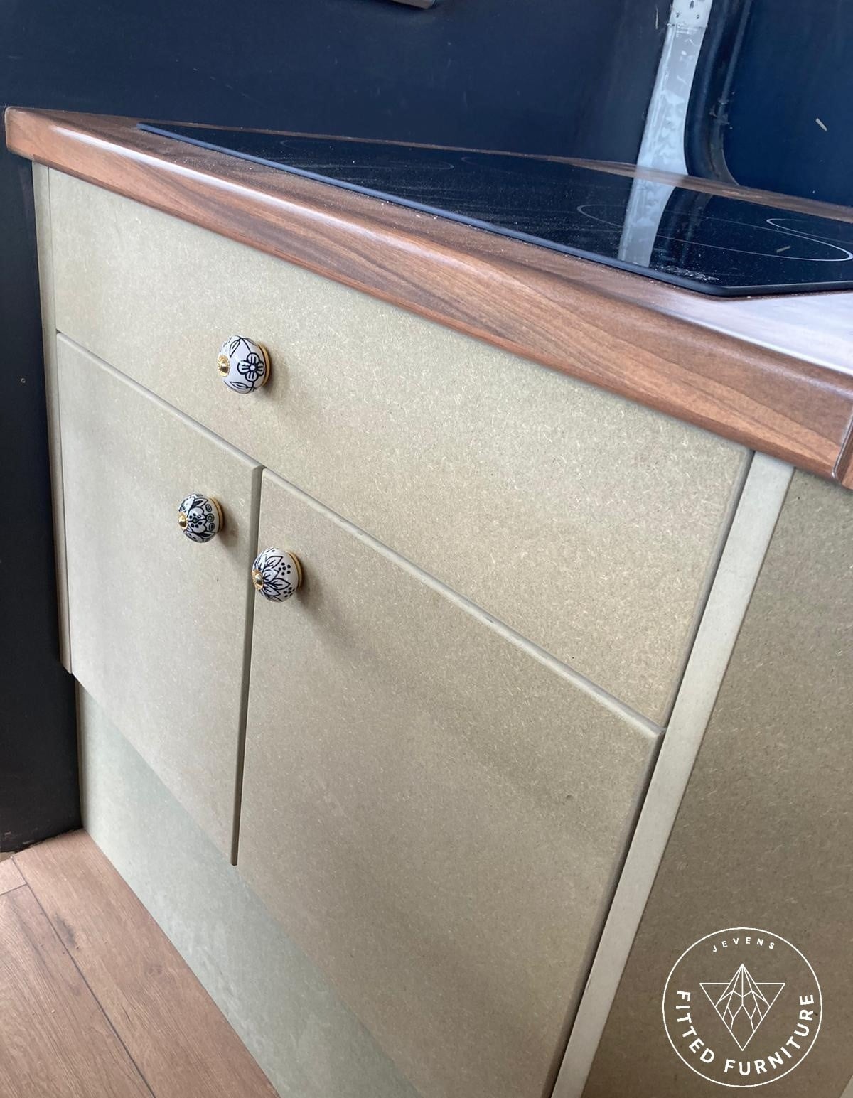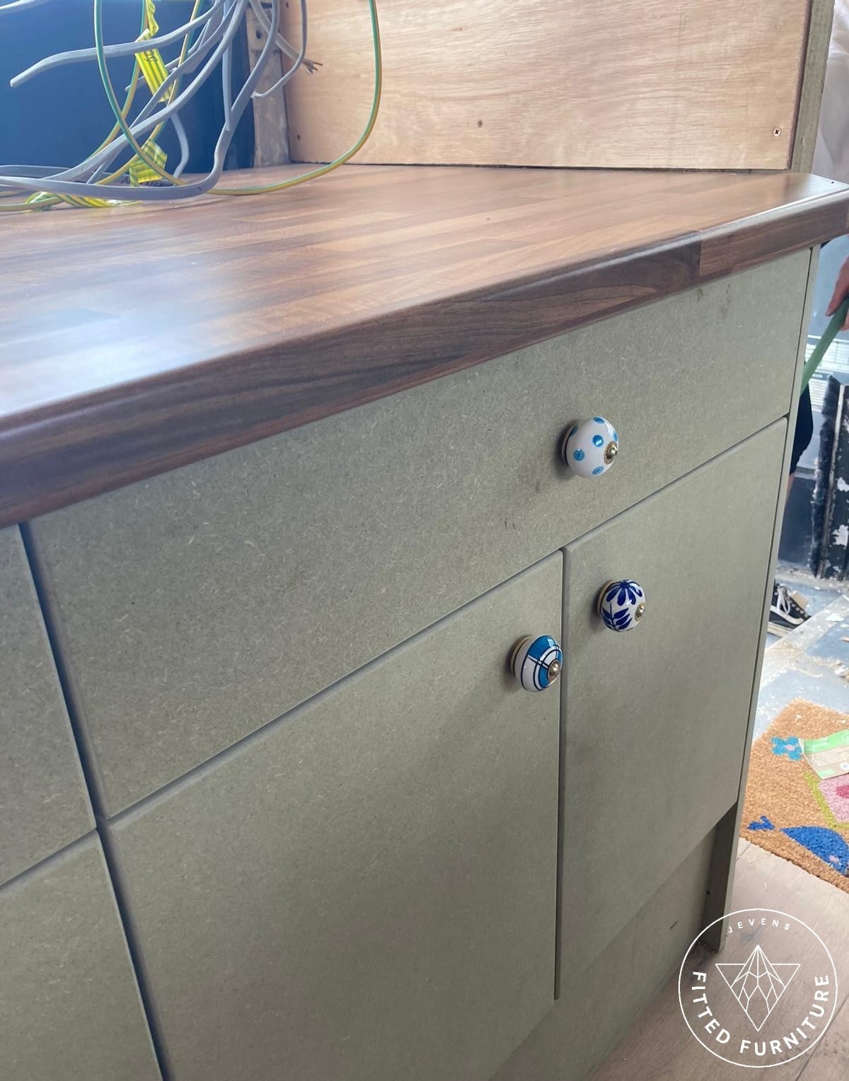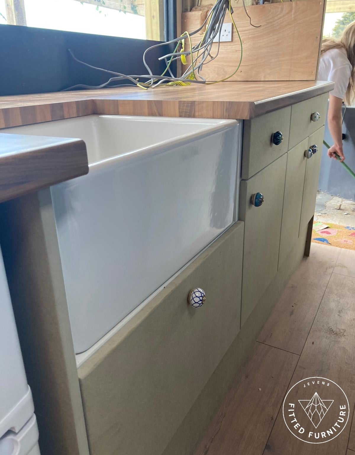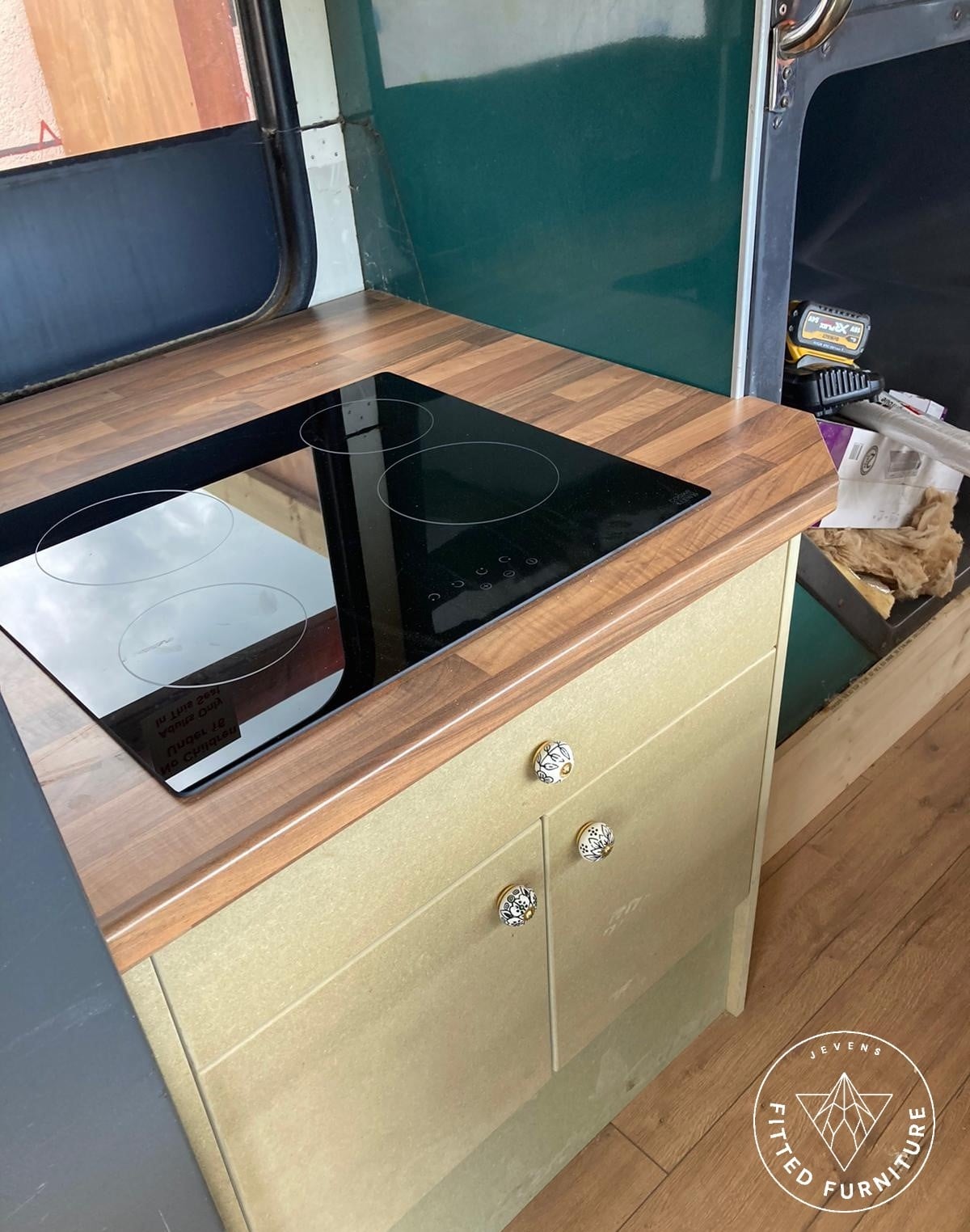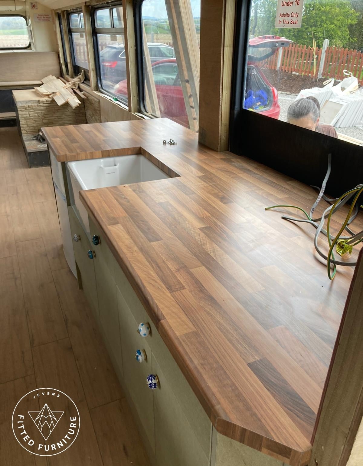 Custom fitted kitchen inside a bus. As seen on the Dermot Bannon show, Super Small Spaces.